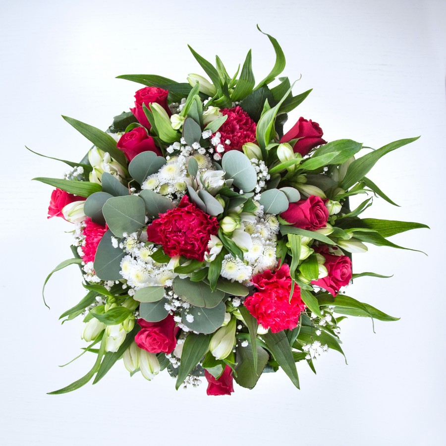 Embrace the graceful harmony of our stunning floral arrangement. This bouquet features red roses and carnations, harmoniously combined with sweet white chrysanthemums and gypsophila, all elegantly arranged with white alstroemeria and aspidistra leaves for a sophisticated touch.